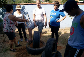 O trabalho começou pouco depois das 7h da manhã. As pessoas, que chegaram a 30, se inteiravam do projeto e definiam tarefas. Enxadas, pás, carrinho, furadeiras, cimento, areia e 100 pneus as aguarvavam. Em uma parede, a coordenadora do Programa Escola Sustentável, Jeane Pukall, já havia fixado um cartaz com fotos do modelo a ser seguido. "Nos inspiramos no parque com pneus usados montado pelo Centro de Educação Infantil Erna Trapp, da Itoupava Rega", disse ela.